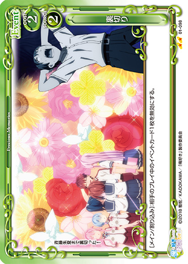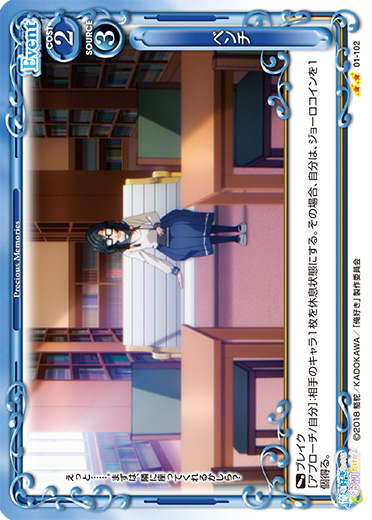| 〔ブレイク〕[アプローチ/相手]:相手のキャラ1枚は、ターン終了時までアプローチでポイントを与えられない。 | ||