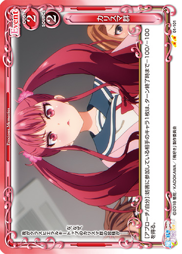 | [アプローチ/自分]:妨害に参加している相手のキャラ1枚は、ターン終了時まで-100/-100を得る。 | ||