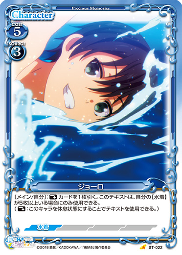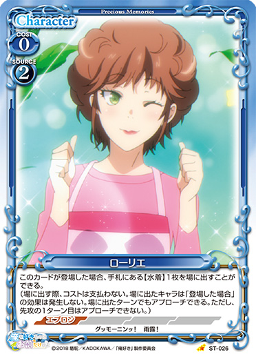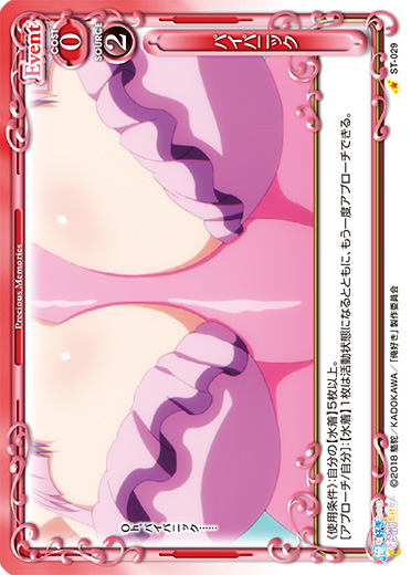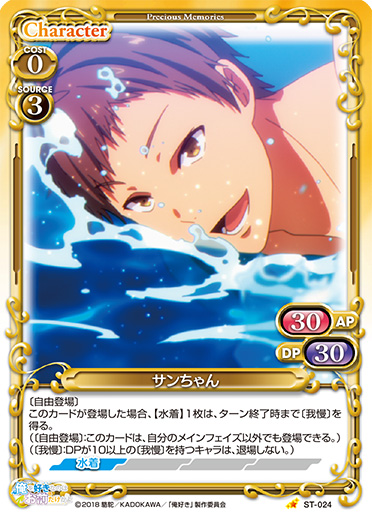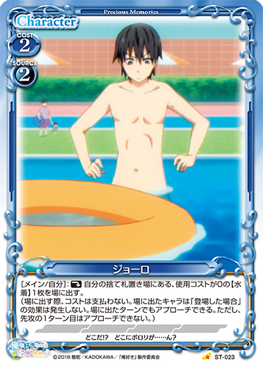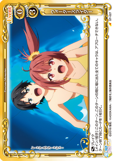 | [メイン/自分]:《休》自分の捨て札置き場にある、使用コストが0の【水着】1枚を場に出す。(場に出す際、コストは支払わない。場に出たキャラは「登場した場合」の効果は発生しない。場に出たターンでもアプローチできる。ただし、先攻の1ターン目はアプローチできない。) | ||