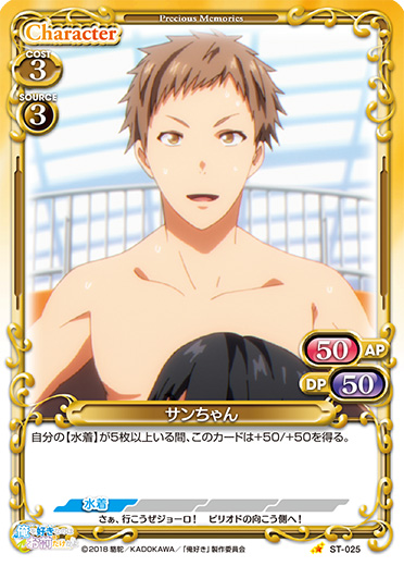 | 自分の【水着】が5枚以上いる間、このカードは+50/+50を得る。 | ||