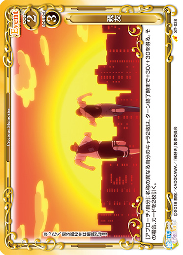 | [アプローチ/自分]:名称の異なる自分のキャラ2枚は、ターン終了時まで+30/+30を得る。その場合、カードを2枚引く。 | ||