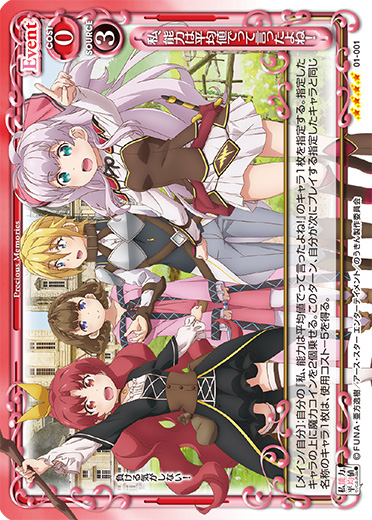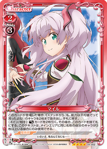 | [メイン/自分]:自分の『私、能力は平均値でって言ったよね!』のキャラ1枚を指定する。指定したキャラの上に魔力コインを2個乗せる。このターン、自分が次にプレイする指定したキャラと同じ名称のキャラ1枚は、使用コスト-5を得る。 | ||