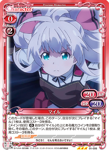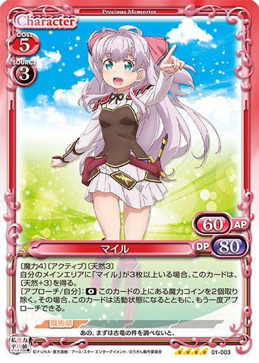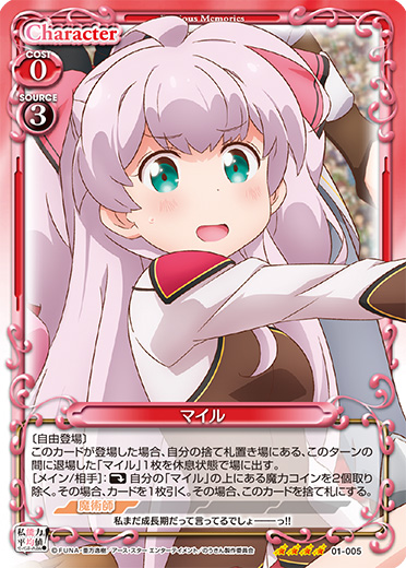 | 〔自由登場〕このカードが登場した場合、自分の捨て札置き場にある、このターンの間に退場した「マイル」1枚を休息状態で場に出す。[メイン/相手]:《休》自分の「マイル」の上にある魔力コインを2個取り除く。その場合、カードを1枚引く。その場合、このカードを捨て札にする。 | ||