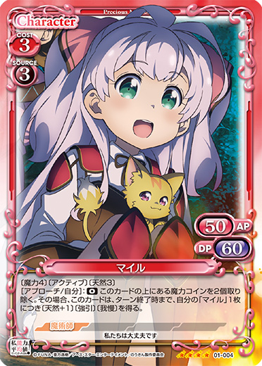 | 〔魔力4〕〔アクティブ〕〔天然3〕自分のメインエリアに「マイル」が3枚以上いる場合、このカードは、〔天然+3〕を得る。[アプローチ/自分]:《0》このカードの上にある魔力コインを2個取り除く。その場合、このカードは活動状態になるとともに、もう一度アプローチできる。 | ||