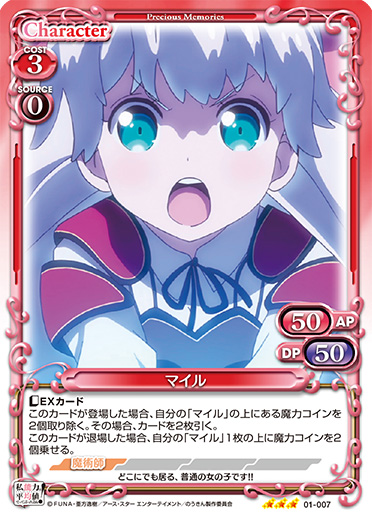 | 〔EXカード〕このカードが登場した場合、自分の「マイル」の上にある魔力コインを2個取り除く。その場合、カードを2枚引く。このカードが退場した場合、自分の「マイル」1枚の上に魔力コインを2個乗せる。 | ||